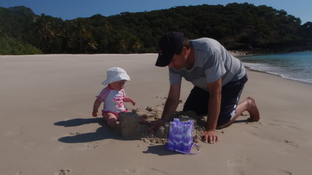 All the other boats in the bay had left by the time we finished breakfast the next day, and so we had the place to ourselves. We sat on the beach and read and swam, drunk fresh coconut juice and argued about what day of the week it actually was. Sophie built some sandcastles with me, played contently and slept.